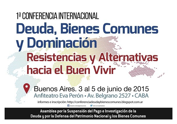 Las organizaciones y los/las participantes en la primera Conferencia Internacional “Deuda, Bienes Comunes y Dominación–Resistencias y Alternativas hacia el Buen Vivir”, realizada en Buenos Aires, Argentina, entre el 3 y el 5 de junio de 2015, luego de analizar y debatir las características del saqueo de nuestros bienes comunes, su vinculación con el endeudamiento público y, con los demás instrumentos de dominación utilizados por las élites del poder económico global para someter a los pueblos y la naturaleza, al igual que transitar hacia alternativas populares y soberanas,