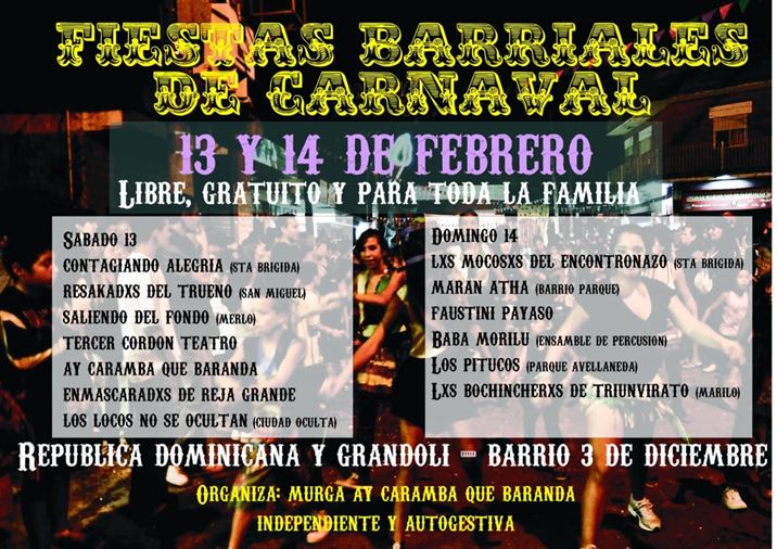 Este sábado 13 y domingo 14 de febrero habrá fiestas barriales de Carnaval, a partir de las 18, en la intersección de las calles República Dominicana y Grandoli en el barrio 3 de Diciembre, Moreno. Organiza e invita la Murga Ay Caramba Que Baranda. Contactos: Rocío 11-3217-3879 / Seba 11-4195-7566