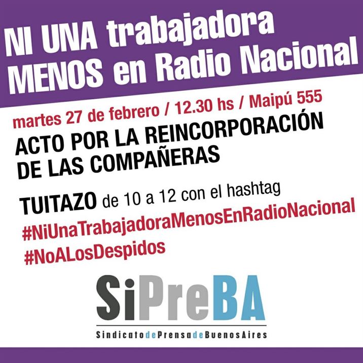El martes 27 de febrero, a las 12.30, se hará un acto para exigir la reincorporación de trabajadores en la emisora pública. Será en la sede ubicada en Maipú 555. Previamente, de 10 a 12, hará un tuitazo con los hashtags #NiUnaTrabajadoraMenosEnRadioNacional y #NoALosDespidos. Los trabajadores de la radio denuncian que las autoridades despidieron a una mujer embarazada y desescolarizaron a una nena al echar a su madre.