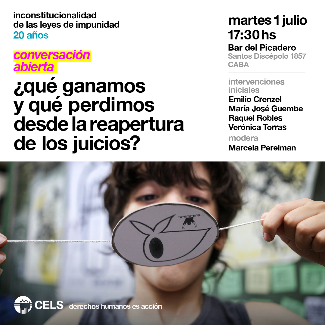 El Centro de Estudios Legales y Sociales (CELS) invita a una conversación abierta para este martes 1 de julio, a las 17.30, en el Bar del Picadero, ubicado en el Pasaje Santos Discépolo 1857 de la Ciudad de Buenos Aires, al cumplirse 20 años del Fallo Simón, a partir del que la Corte Suprema declaró