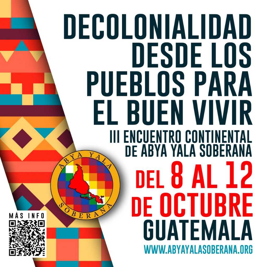Organizaciones sociales urbanas, campesinas e indígenas, procedentes de diferentes territorios del Continente, articulados en el espacio de Abya Yala Soberana, se reunirán en el III Encuentro Continental denominado: Decolonialidad desde los pueblos para el Buen Vivir desde el 8 al 12 de octubre en Guatemala.