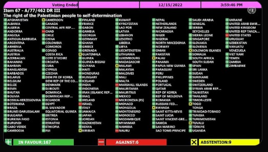 La Asamblea General de las Naciones Unidas (AGNU) afirma el derecho de los palestinos a la libre determinación en sus territorios con mayoría de votos a favor.167 estados votaron a favor de la resolución, 9 se abstuvieron y seis votaron en contra, entre ellos Israel y EEUU.