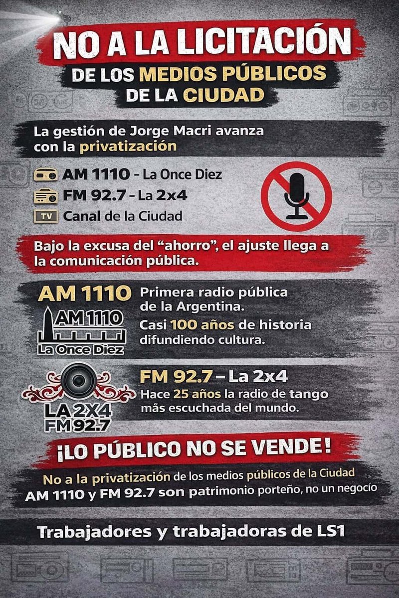 La Asamblea de Trabajadorxs de Medios Públicos de la Ciudad de Buenos Aires difundió un comunicado en el rechaza la decisión del jefe de gobierno porteño, Jorge Macri, de licitar las radios y el canal de la Ciudad, ya que pone en riesgo no solo las fuentes laborales, sino también el acceso a la información,