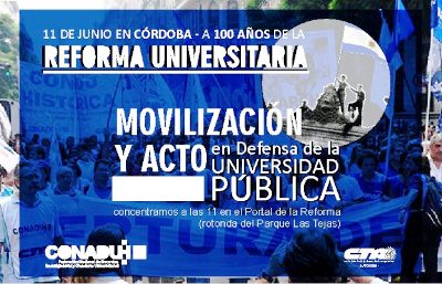 La Federación Nacional de Docentes, Investigadores y Creadores Universitarios (CONADU Histórica-CTA) realizará este lunes 11 de junio una movilización en la ciudad de Córdoba, en el marco de la Semana Nacional de Lucha lanzada en conmemoración del Centenario de la Reforma Universitaria de 1918. La concentración será a las 11, en el Portal de la