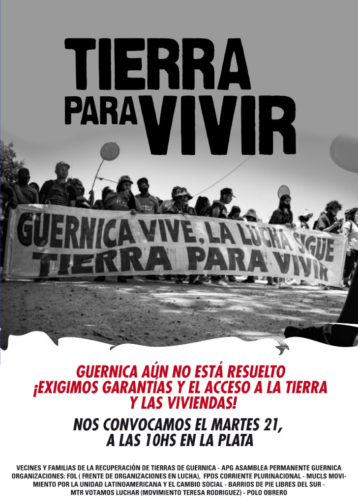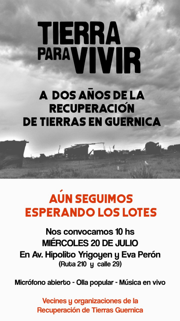 Vecines y organizaciones de la Recuperación de Tierras de Guernica se convocan este miércoles 20 de julio, a partir de las 10, en Avenida Hipólito Yrigoyen y Eva Perón, Ruta 210 y Calle 29. Habrá micrófono abierto, olla popular y música en vivo. Advierten que a dos años, siguen sin la tierra y esperando los