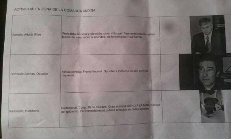 La mayoría de los espiados integra la Asamblea No a la Mina de Esquel, hay docentes, médicos, comerciantes, empleados públicos, abogados, periodistas, y miembros de la comunidad mapuche. Quien hizo público estas fichas, que incluyen nombres, fotos y actividades de al menos 22 personas fue el defensor de la comunidad Fernando Radziwilowski.