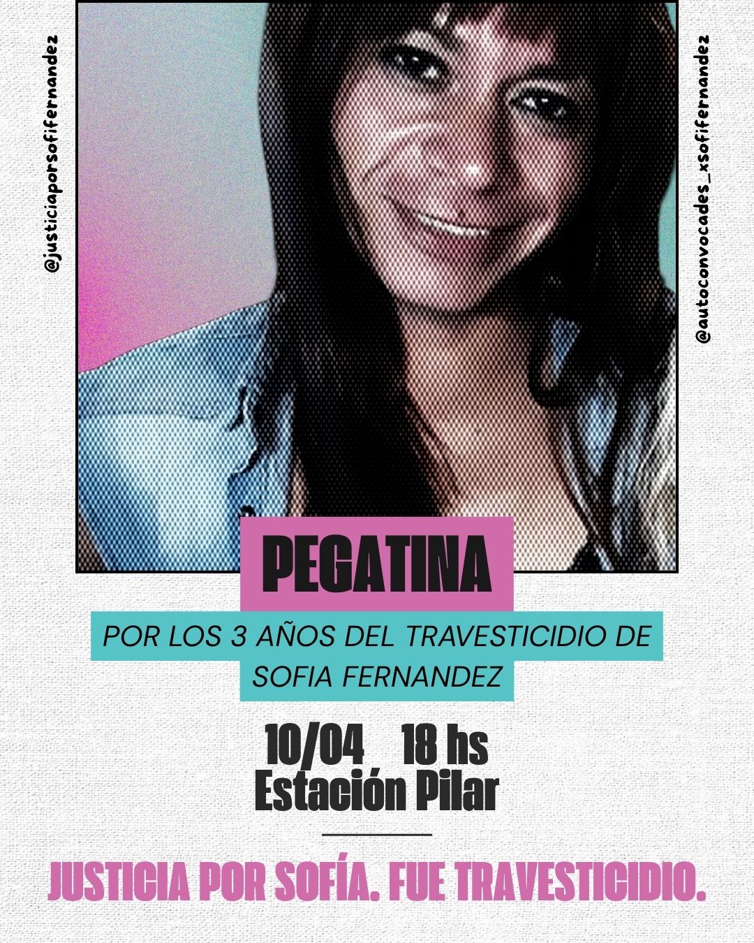 Familiares y amigos de Sofía realizarán este viernes 10 de abril, a partir de las 18, actividades de difusión para recordarla y seguir reclamando justicia en la Estación de Pilar. Sofía era una mujer trans que en abril de 2023 fue detenida acusada de un delito y apareció muerta en el interior de un calabozo de la comisaría 5° de Derqui, Pilar. La versión policial habló de suicidio pero, desde un primer momento, la familia y compañeras denunciaron su travesticidio.