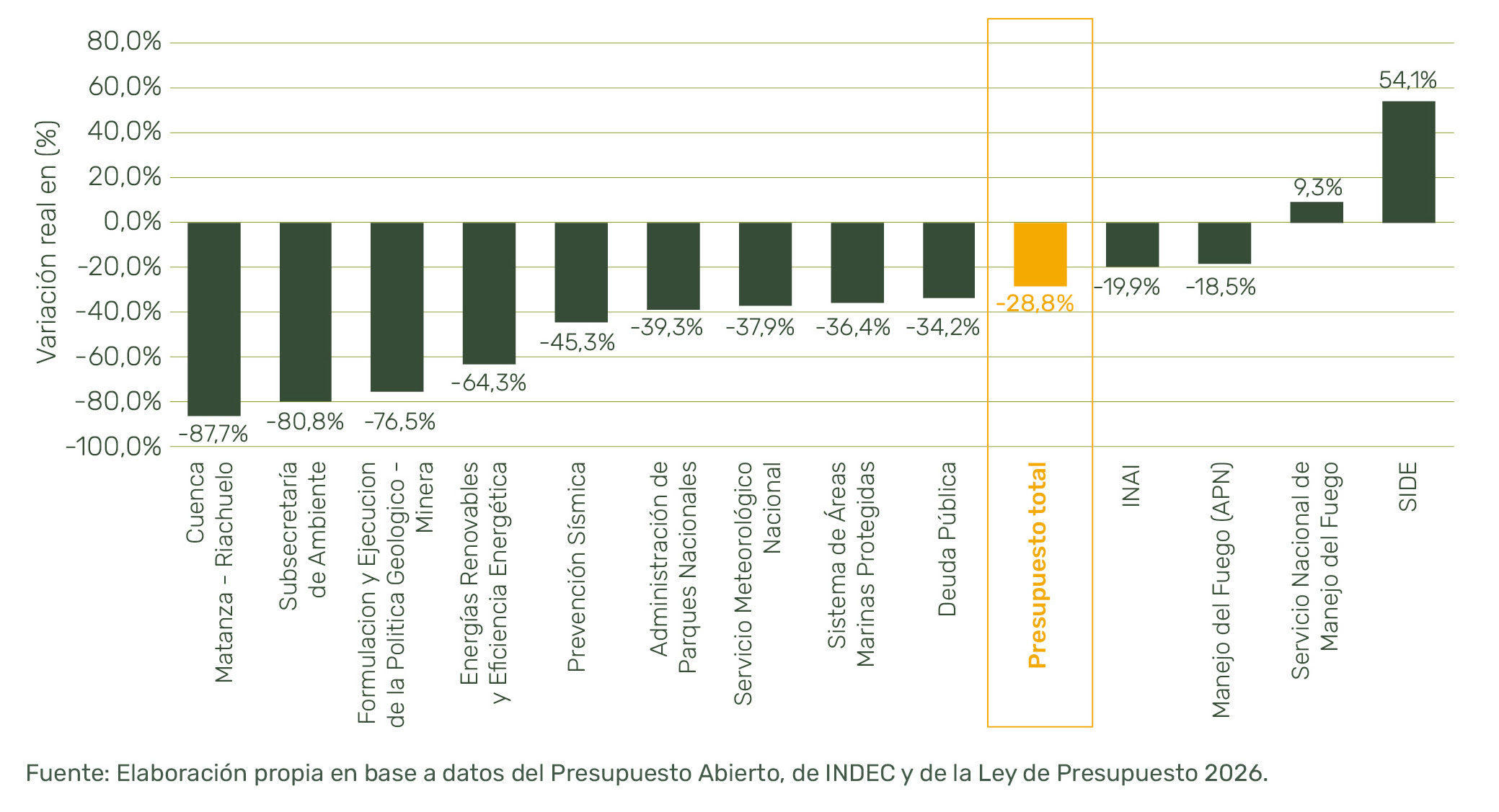 El resultado fue la consolidación de un proceso de ajuste, con impactos particularmente severos en el financiamiento de políticas ambientales, que en algunos casos registraron caídas reales cercanas al 95%, como sucedió con el Fondo Nacional para la Conservación y Enriquecimiento de los Bosques Nativos.