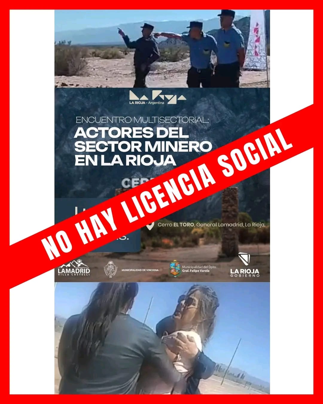 Desde las Asambleas agregan que mientras esto ocurría afuera del predio, dentro del evento representantes de 9 empresas mineras, autoridades y funcionarios buscaban lanzar la multisectorial para afianzar la megaminería en la cordillera riojana bajo el lema de “transparencia” y “sustentabilidad” de la actividad. “Pero con el pueblo mirando desde afuera y con una vecina detenida en la comisaría sin ningún motivo. El modelo minero, como en San Juan, Catamarca y Jujuy se impone con represión”, advierten.