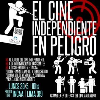 Desde la Asamblea Abierta en Defensa del Cine independiente convocamos, el lunes 28 de mayo a las 10 hs, a concentrarnos en las puertas del INCAA (Lima 319 C.A.B.A.) para movilizarnos hasta la ENERC donde se estará desarrollando la reunión del Consejo Asesor y luego la Asamblea Federal.