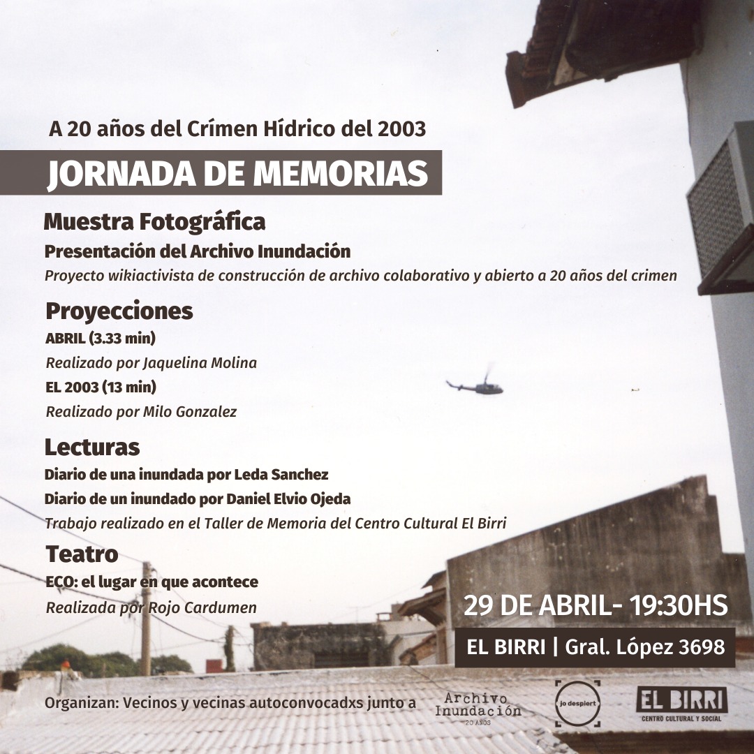 Durante la jornada, se presentarán dos diarios inéditos, narrados en la diáspora del crimen hídrico. Sus autores son Leda Sánchez y Daniel Elvio Ojeda, vecinxs del barrio y quienes acompañarán en la presentación. Se proyectarán audiovisuales también inéditos, producidos en articulación con el ISCAA. Además, se dará a conocer el sitio web “archivoinundacion.ar” y se reestrena la obra “Eco…el lugar en que acontece”