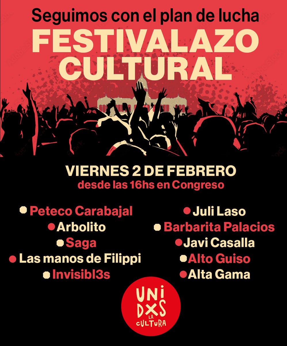 Unidxs por la Cultura organiza un Festivalazo Cultural este viernes 2 de febrero en Plaza Congreso, desde las 16.30, con el objetivo de “fortalecer la lucha en defensa de nuestra cultura, contra la Ley Ómnibus, el DNU y el Protocolo Antipiquetes que intenta imponer el gobierno de Javier Milei”. Porque la cultura es necesaria y está en emergencia, actuarán Peteco Carabajal, Arbolito, Saga, Las Manos de Filippi, Invisibl3s, Juli Laso, Barbarita Palacios, Javi Casalla, Alto Guiso, Alta Gama.