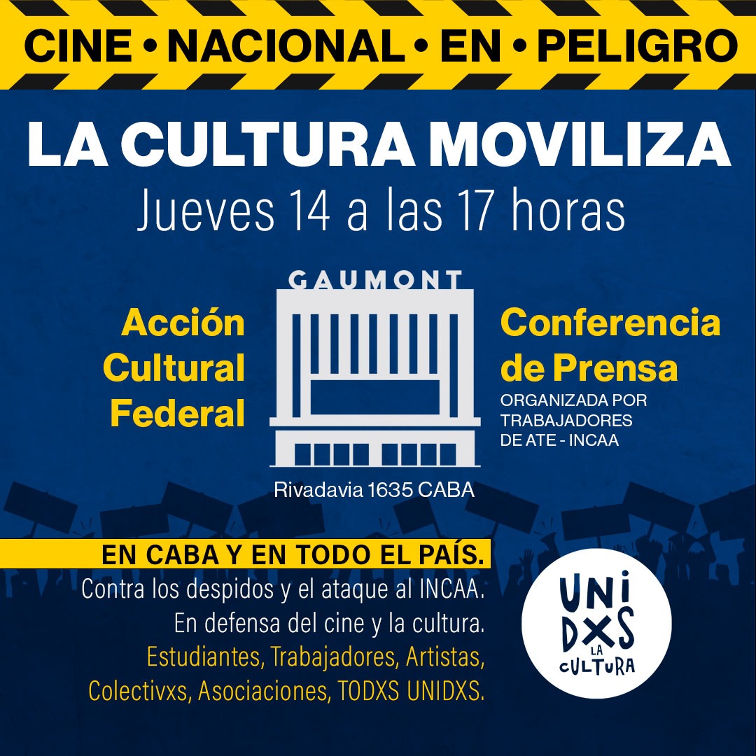 Ante esta situación se convoca a una Acción Cultural Federal y a una conferencia de prensa (organizada por ATE INCAA) para este jueves 14 de marzo en todo el país. En la Ciudad de Buenos Aires, el acto será frente al Cine Gaumont.