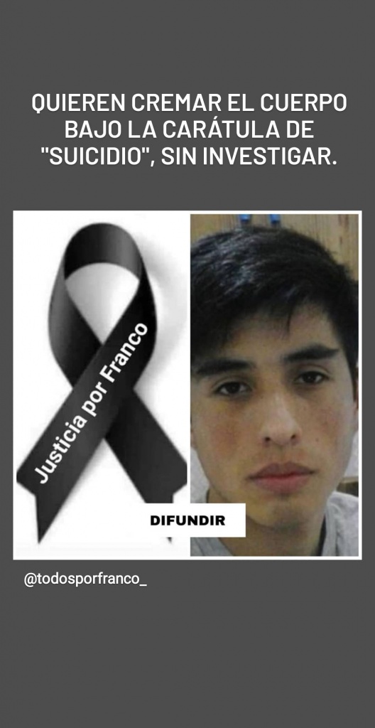 2. Nos hicieron esperar para identificar a Franco hasta este sábado, día en el cual la Fiscalía 11 de CABA no nos atiende los teléfonos. El fiscal nos informó que ya quiere cerrar abruptamente la causa y cremar el cuerpo de nuestro hermano bajo la carátula de “suicidio”. La familia RECHAZA esta hipótesis y exige una investigación en serio, es INACEPTABLE que la Fiscalía se niegue a hablar con nosotros, se niegue a mostrarnos los resultados de la autopsia y quiera eliminar el cuerpo de Franco.