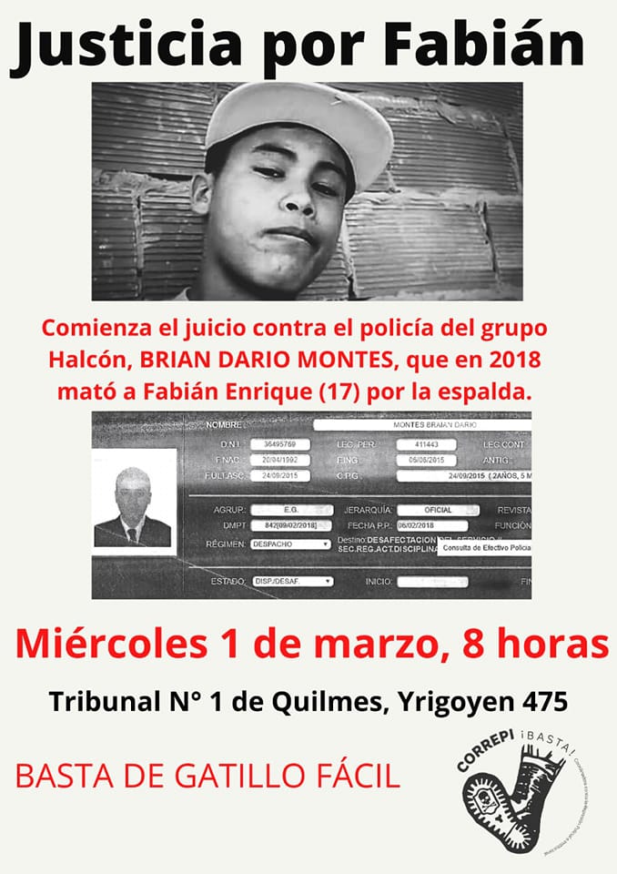 Según relatan desde Correpi, el 6 de febrero de 2018 el policía bonaerense Brian Darío Montes disparó al menos siete veces contra dos adolescentes en un barrio de Quilmes. Tres de los disparos impactaron en el cuerpo de Fabián de 17 años, dos en la espalda y una en la parte posterior de la pierna.