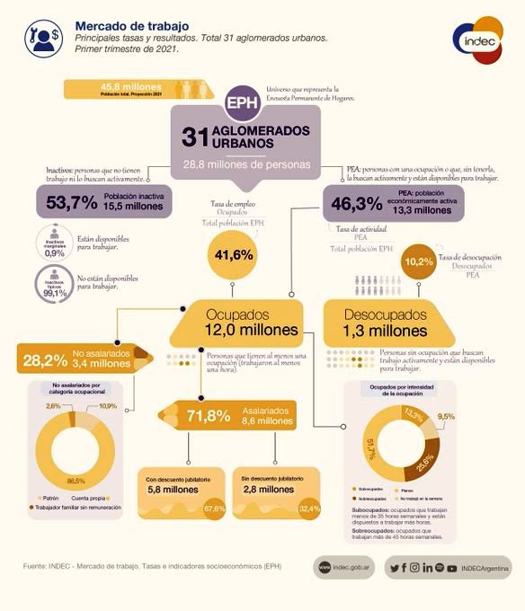 Según datos del INDEC, el índice de desempleo en el país fue de 10,2 % en el primer trimestre del año. La tasa de desocupación fue superior en mujeres (12,3%) que en varones (8,5%) y afectó más a las y los jóvenes (24,9% y 17%, respectivamente).