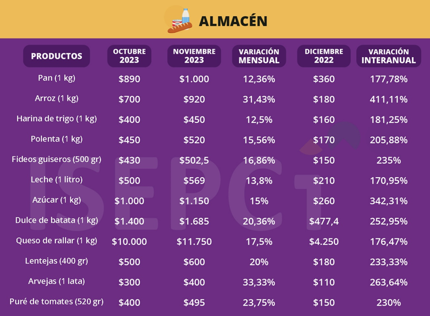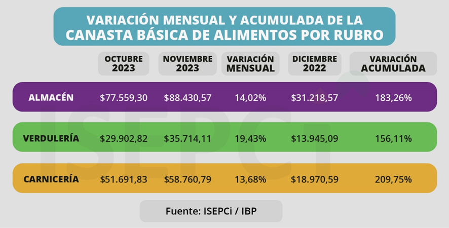 Según el relevamiento mensual que realiza el Instituto de Investigación Social, Económica y Política Ciudadana (Isepci) en 850 negocios de cercanía de barrios populares de 20 distritos del conurbano bonaerense, los valores de los 57 productos de la Canasta Básica de Alimentos (CBA) en noviembre subieron 14,8%. De esta manera, una familia de dos adultos/as y dos hijos/as pequeños/as que en octubre necesitaba 159.153,96 pesos para adquirir alimentos indispensables, en noviembre precisó 182.905 pesos para cubrir los mismos gastos.