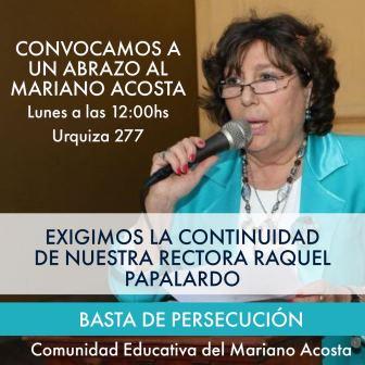 Raquel Papalardo recibió la noticia que desde este viernes dejaba de ser la rectora de la institución. En repudio a esta medida del gobierno, la Comunicad Educativa del Mariano Acosta convoca para este lunes a las 12.00 a realizar un abrazo al colegio (Urquiza 277-CABA)