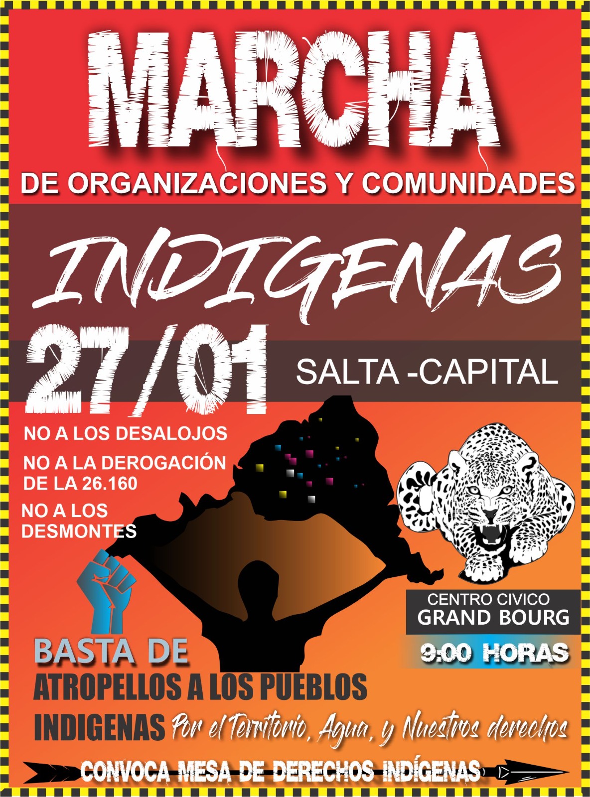 La Mesa de Derechos Indígenas se movilizará este lunes 27 de enero, a partir de las 9, desde el Centro Cívico Grand Bourg de la Ciudad de Salta, para exigir “NO a los desalojos, NO a la derogación de la ley 26.160, NO a los desmontes, BASTA de atropellos a los pueblos indígenas”. Compartimos convocatoria.