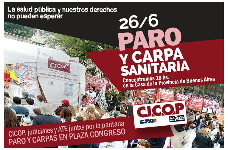 Será instalada este miércoles 26 de junio, desde las 10 en Plaza Congreso de la Ciudad de Buenos Aires. Es ante la falta de convocatoria paritaria del gobierno bonaerense a los profesionales de la salud de la provincia. “Finalizando la primera mitad del año, en un contexto de crisis del sistema y sin respuestas a cada uno de los históricos reclamos de CICOP, la situación se ha vuelto insostenible”, afirmaron desde CICOP quienes realizarán esta jornada de paro y lucha junto a trabajadores estatales y judiciales.