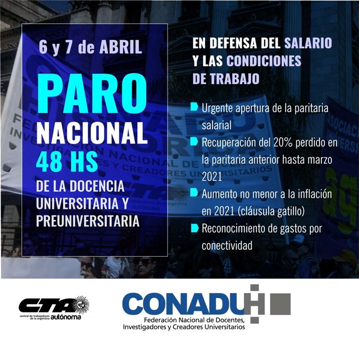 La docencia universitaria y preuniversitaria exige una recomposición salarial que supere las previsiones inflacionarias del presente año, y hasta el momento no ha tenido respuesta ni convocatoria a reunión. Demanda, además, el reconocimiento de gastos en la enseñanza virtual y cumplimiento del Convenio Colectivo de Trabajo en lo referido a las condiciones y medio ambiente de trabajo en el marco de la pandemia.