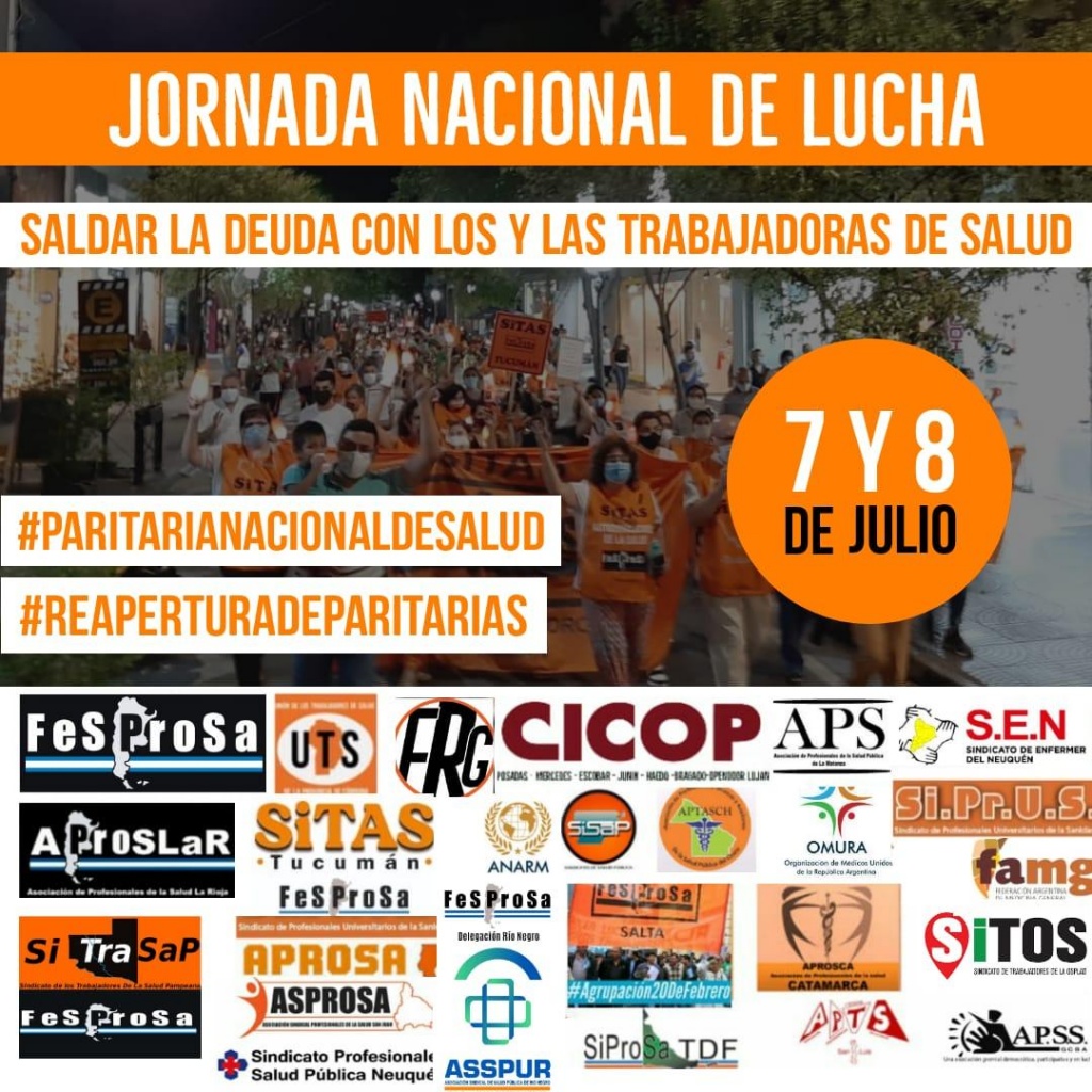 Se desarrolla este miércoles 7 y jueves 8 de julio, bajo las consignas “Reparar la deuda con las y los trabajadores de salud, Reapertura de paritarias y Convocatoria a la paritaria nacional de salud”. También se reclamará por la desprecarización laboral de los trabajadores, el cobro inmediato del bono, y el cese de la represión y persecución contra trabajadores y trabajadoras de la salud que protestan, en particular en las provincias de Córdoba, Tucumán y Río Negro.