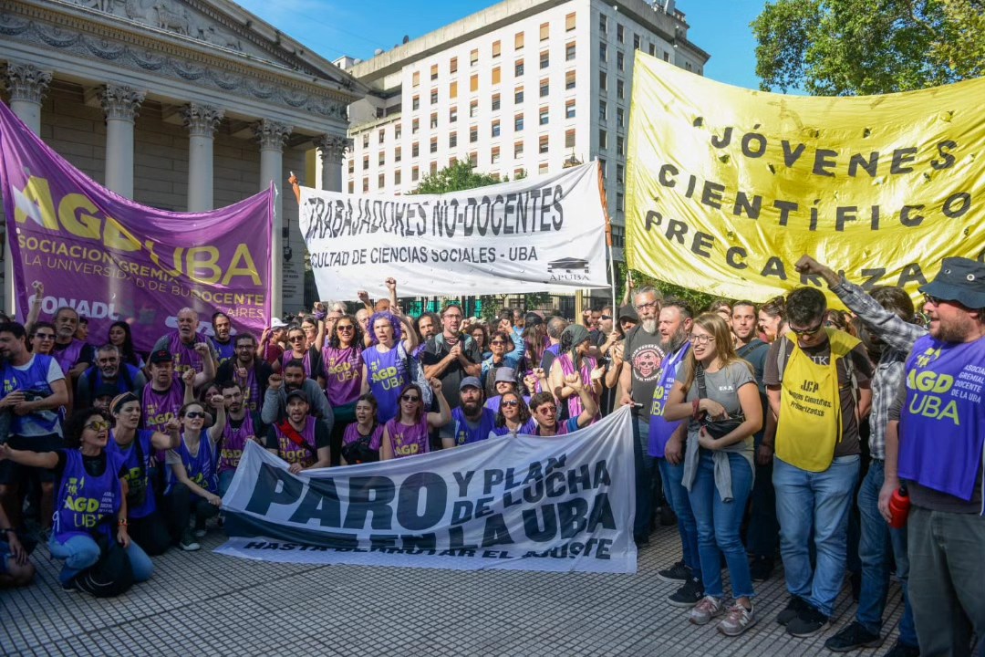 “El banderazo es una acción convocada por docentes de la UBA e investigadores del Conicet en defensa de la universidad y la ciencia públicas para visibilizar la crítica situación que se vive en nuestras facultades, colegios preuniversitarios e instituciones científicas como resultado del ajuste presupuestario al que nos somete el gobierno nacional”, expresó Ileana Celotto, secretaria general del sindicato AGD-UBA.
