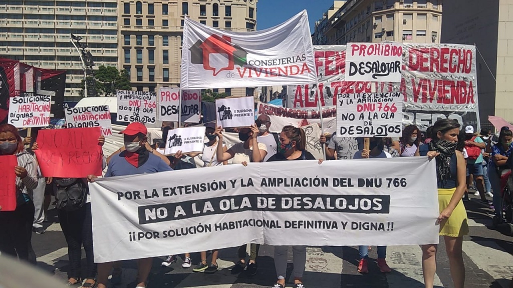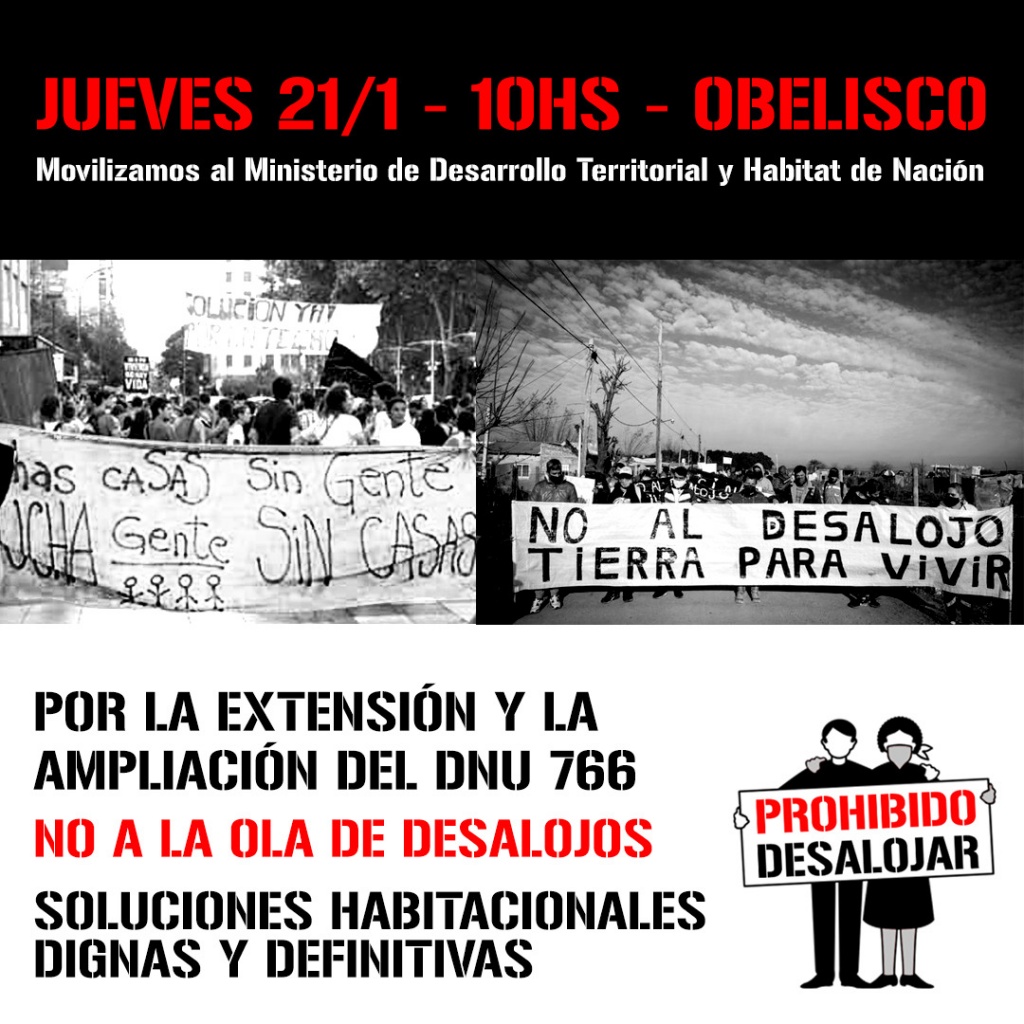 Junto a organizaciones sociales, y nucleados en la Campaña #ProhibidoDesalojar, marcharán el jueves 21 de enero, a las 10, desde el Obelisco hasta el Ministerio de Desarrollo Territorial y Hábitat de Nación, que encabeza Jorge Ferraresi, para exigir la extensión y la ampliación del DNU 766 (que vence el próximo 31/1), demandar una respuesta habitacional