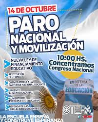 La central anunció la realización de una Jornada Nacional de Lucha y Paro Nacional, con múltiples actividades en todo el país, en defensa de la educación pública, los derechos de las y los trabajadores de la educación, y por una nueva Ley de Financiamiento Educativo, la convocatoria a la Paritaria Nacional Docente, la restitución del FONID y el pago de las sumas adeudadas, así como por mayor presupuesto educativo que garantice condiciones dignas para enseñar y aprender. Será este martes 14 de octubre e incluirá una movilización frente al Congreso Nacional.