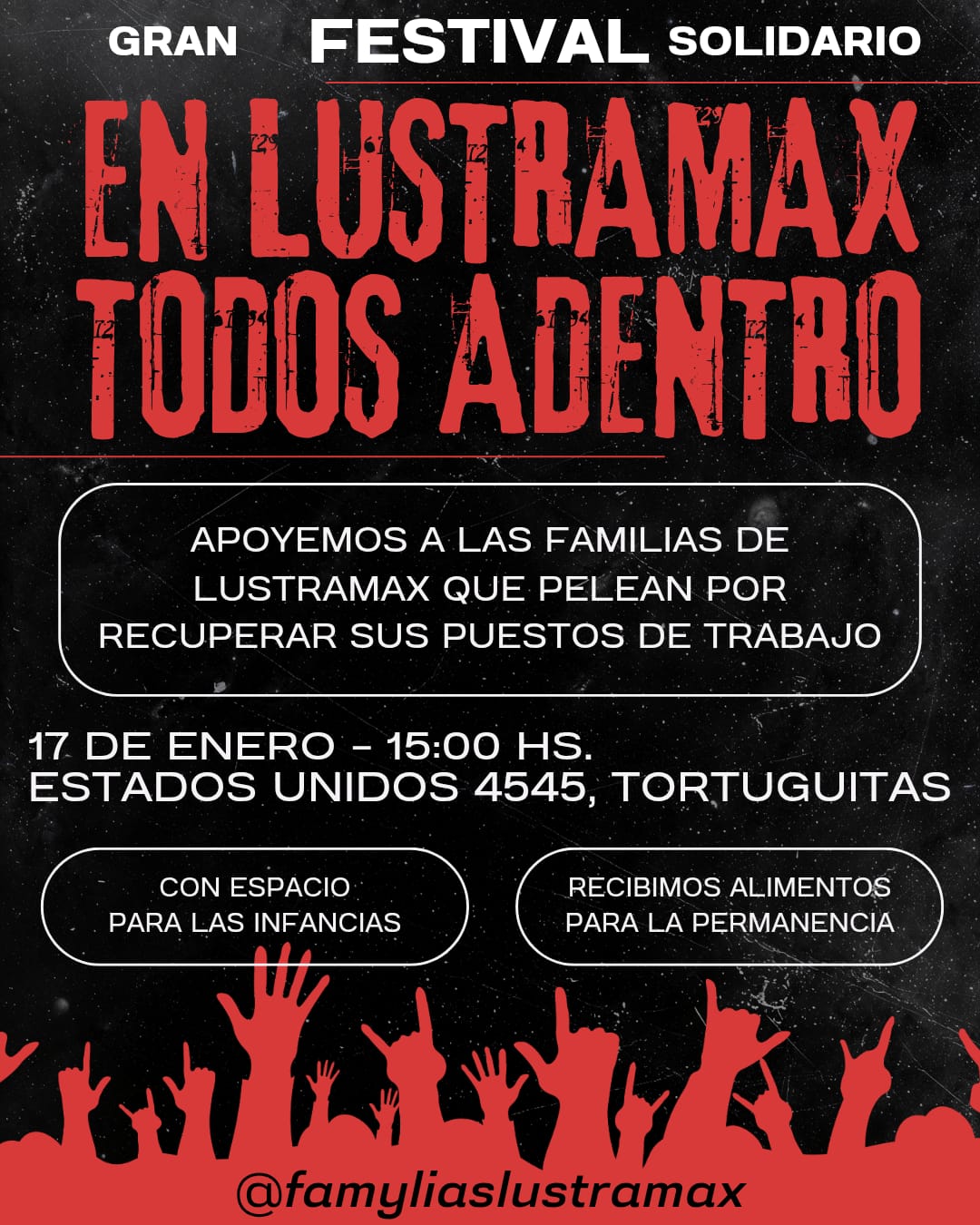Será este sábado 17 de enero, a partir de las 15, en Estados Unidos 4545 de Tortuguitas, en apoyo a las familias de Lustramax que pelean por recuperar sus puestos de trabajo. Habrá espacios para las infancias y se pueden llevar alimentos para la permanencia.