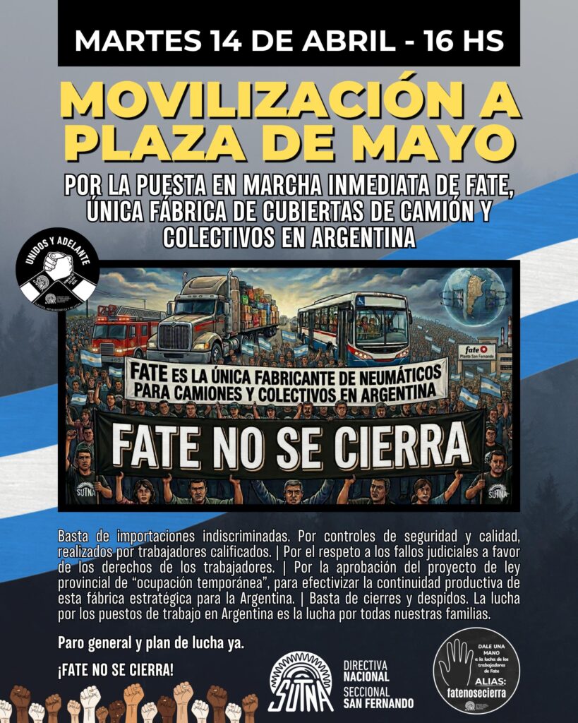 Finalmente, este martes 14 de abril habrá una movilización a Plaza de Mayo por la puesta en marcha inmediata de la fábrica de FATE. Será a las 16 y estará acompañada por numerosos sindicatos, organizaciones obreras, sociales y de jubilados.