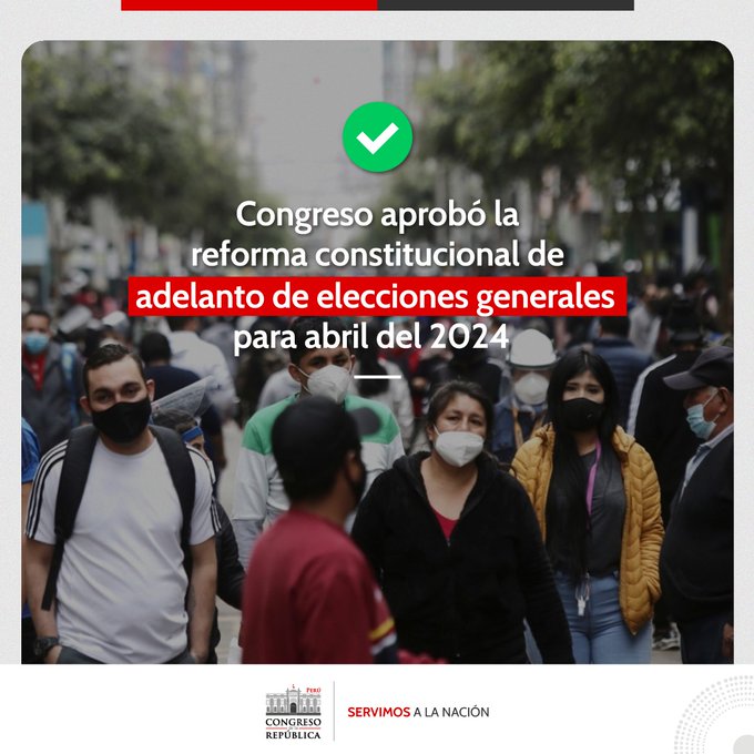 El pleno del Congreso de Perú aprobó este martes el proyecto de ley que propone el adelanto de elecciones generales para abril de 2024, en medio de las movilizaciones que se registran en varias regiones del país.