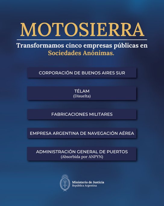 Corporación Buenos Aires Sur, Fabricaciones Militares, la Empresa Argentina de Navegación Aérea (EANA), la Administración General de Puertos (AGP) y la agencia estatal Télam son las empresas públicas alcanzadas por el nuevo capítulo en la ofensiva gubernamental para “modernizar” el Estado. Todas fueron reconvertidas formalmente en sociedades anónimas, salvo Télam, que fue directamente disuelta.