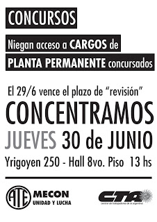 Mañana miércoles vence la revisión de los concursos establecida por el Decreto Nº 254/2015 y la Junta Interna de ATE del Ministerio de Hacienda denuncia que la revisión “está dando de baja de cargos concursados y ganados por nuestros compañeros y compañeras, muchos de los cuales concursaron sus funciones, lo cual genera condiciones para que