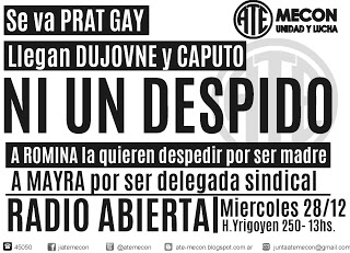 Este miércoles 28 de diciembre a las 13.00 los trabajadores del MECON realizarán una radio abierta en las puertas del Ministerio de Economía (Yrigoyen 250, CABA). “Se va Prat Gay, exigimos a las nuevas autoridades la continuidad laboral de las compañeras”, exigen en el comunicado que compartimos.