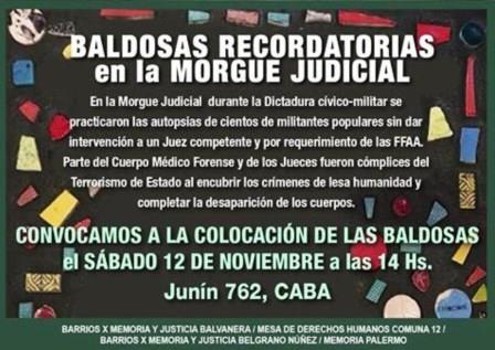 El sábado 12 de Noviembre, quienes integran Barrios x Memoria y Justicia Balvanera, la Comisión de la Memoria Belgrano Nuñez, la Mesa x la Memoria y los Derechos Humanos Comuna 12 y Memoria Palermo colocarán Baldosas por la Memoria frente a las entradas de la Morgue Judicial – Cuerpo Médico Forense .Será a partir de
