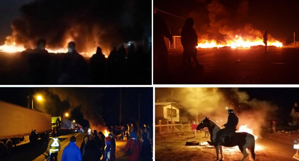 El martes 24 de marzo se realizaron acciones de protesta con bloqueos, cortes de ruta y barricadas en diversos puntos de Chiloé como respuesta a la violencia ejercida por fuerzas represivas estatales quienes quebrantaron la aduana sanitaria para abrir ´por la fuerza el flujo de camiones de la industria salmonera y de mitilicultura provenientes del