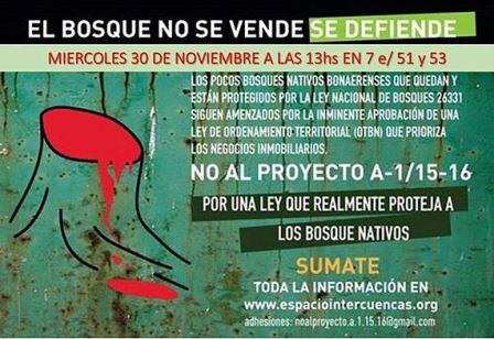 Vecinos de las localidades de Quilmes y Avellaneda llevan adelante una campaña para impedir la aprobación de una ley que perjudica a los bosques nativos y, a su vez, exigir una ley que proteja a los mismos. Convocan a movilizarse frente a la Legislatura provincial de La Plata hoy a las 13.