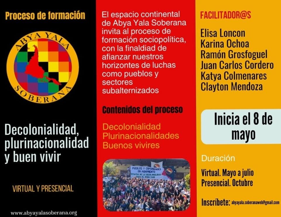 Desde el espacio de articulación Abya Yala Soberana invitan al primer proceso de formación en Decolonialidad, Plurinacionalidad y Buen Vivir. Acompañarán este proceso de formación varios investigadores y docentes que tienen una larga trayectoria y que vienen trabajando con estos conceptos tanto de manera intelectual, como práctica en sus países.