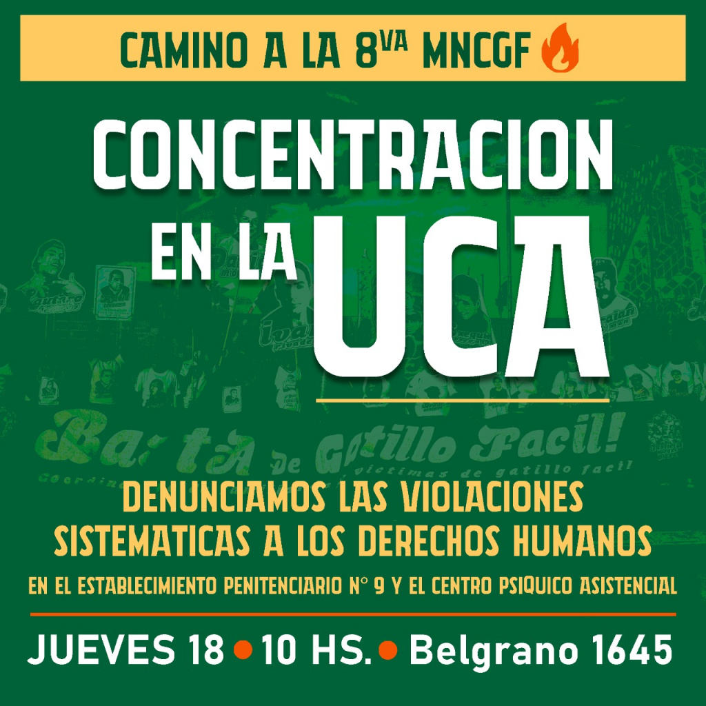 Organizaciones políticas, sociales, de derechos humanos y familiares de víctimas de la represión del Estado convocan a una concentración el próximo jueves 18, a las 11 hs., en la Unidad de Contención de Aprehendidos (UCA). El objetivo de la actividad es denunciar las irregularidades y violaciones sistemáticas a los derechos humanos en el establecimiento penitenciario