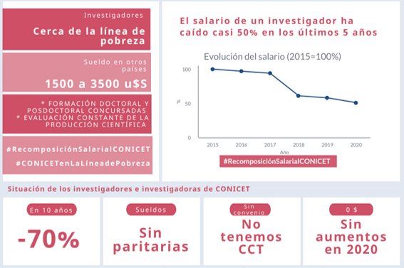 Investigadores e investigadoras del Consejo Nacional de Investigaciones Científicas y Técnicas (CONICET) afirman que sus salarios cayeron más del 50% desde fines de 2015 y exigen un convenio colectivo de trabajo para el sector.