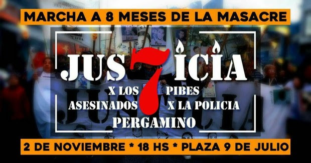 A 8 meses del asesinato de los 7 pibes – el pasado 2 de marzo- en la Comisaría 1° de Pergamino, el Colectivo Justicia x los 7 convoca a marchar desde el Árbol de la Memoria, en la Plaza 9 de Julio, hasta la Plaza Merced este 2 de noviembre, a las 18 horas.