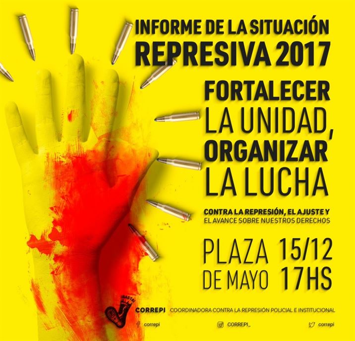 El sábado 20 de enero a las 18.00, Correpi convoca a la presentación de su Informe de la situación represiva nacional y del Archivo de casos de personas asesinadas por el aparato represivo estatal al 2017. Se realizará una charla-debate. Habrá proyecciones, mesa de materiales, buffet a precios populares. Espacio político-cultural “El Churqui”. Joly 2639.