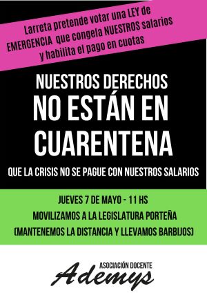 Este jueves 7 de mayo habrá distintas protestas y movilizaciones en la Ciudad de Buenos Aires en repudio al intento del gobierno porteño de congelar salarios y permitir el pago en cuotas. La principal será a la mañana frente a la Legislatura. Además, trabajadores de la salud exigirán mejores condiciones laborales.
