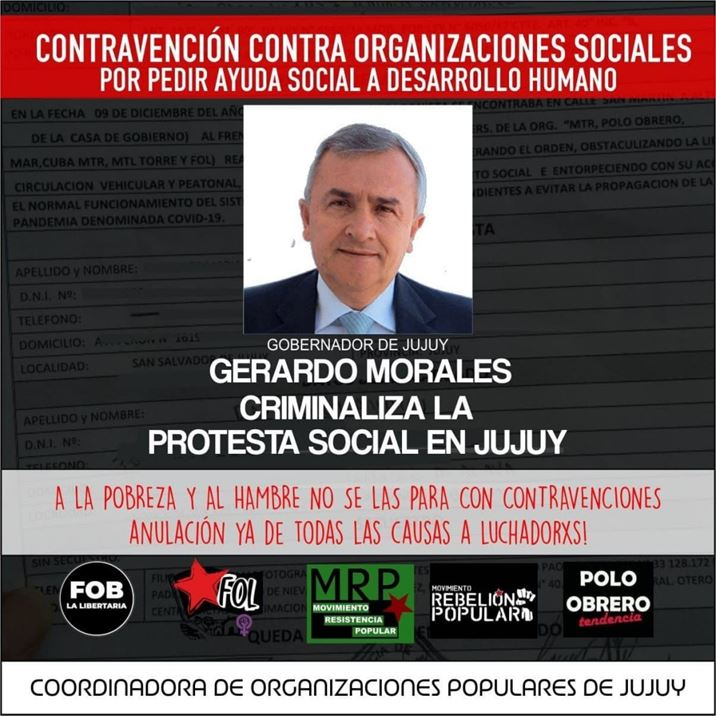 La Coordinadora de Organizaciones Populares de Jujuy, integrada por el Frente de Organizaciones en Lucha, Polo Obrero Tendencia, Rebelión Popular, Movimiento Resistencia Popular y FOB La Libertaria, denunció el estado de criminalización y persecución política de la cual son banco luchadoras y luchadores sociales. Compartimos el comunicado