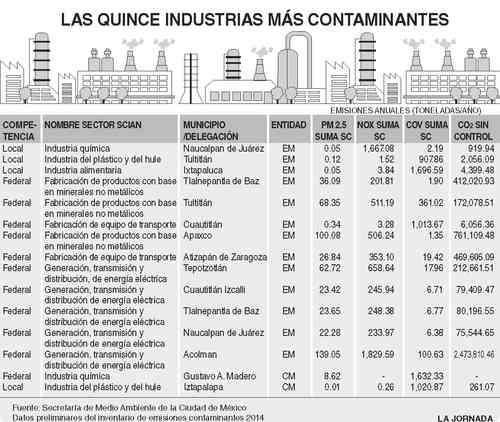 Al día son arrastradas por el aire 140 mil toneladas de emisiones contaminantes, en promedio. La mayoría de éstas son generadas por industrias químicas, alimentarias, cementeras y de fabricación de plásticos, así como de generación y transmisión de energía eléctrica, cuyas instalaciones rodean la Ciudad de México en 80 por ciento.