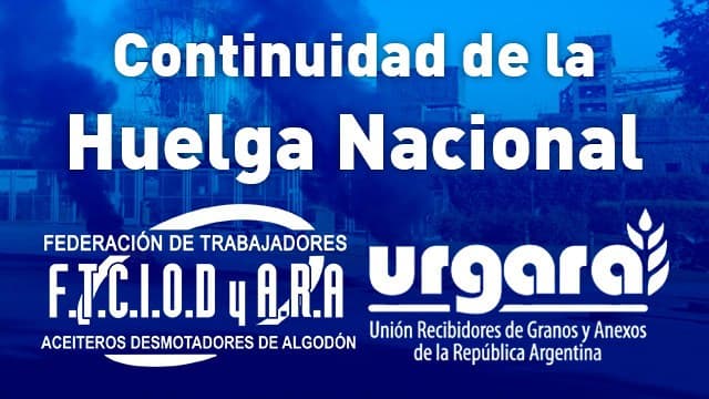La Federación de Trabajadores del Complejo Industrial Oleaginoso, Desmotadores de Algodón y Afines de la República Argentina (FTCIODyARA) y la Unión Recibidores de Granos y Anexos de la República Argentina (URGARA), ante la falta total de respuesta de parte de las cámaras patronales, han definido la continuidad de la Huelga Nacional en la industria aceitera