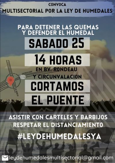 Este sábado 25 de julio, a las 14, la Multisectorial por la Ley de Humedales iniciará el segundo corte total del puente Rosario-Victoria, para exigir además castigo efectivo a las personas responsables de los incendios, la intervención del gobierno nacional y de las provincias implicadas.