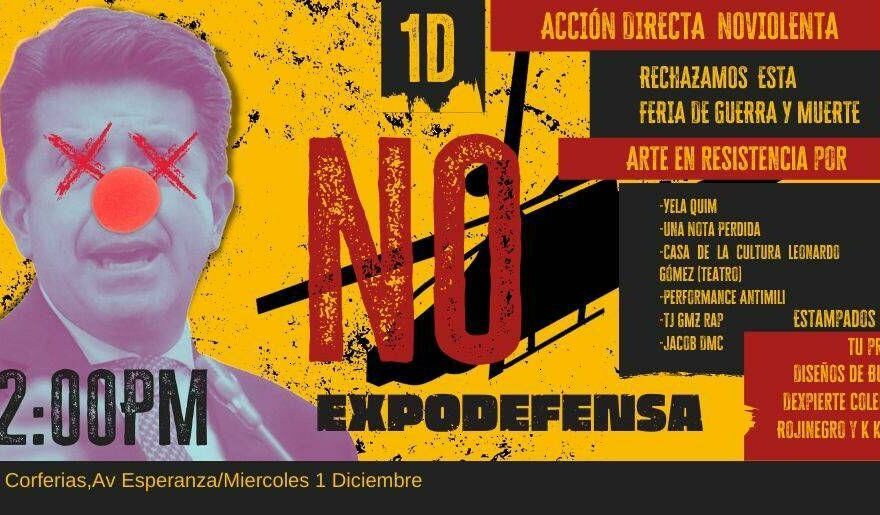 Organizaciones antimilitaristas asistieron a esta exposición bélica a denunciar a las empresas que hacen de Colombia un mercado para las versiones más recientes de sus servicios y equipamientos armamentísticos.