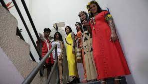 Brasil: desfiles de moda indígenas como medio de resistencia contra Bolsonaro · Luciendo con orgullo sus majestuosos tocados de plumas, los modelos cantan una oda a la lluvia, mientras los maquilladores dibujan líneas negras en sus rostros, brazos y muslos, en el primer evento de moda indígena realizado en Brasil, en Manaus.